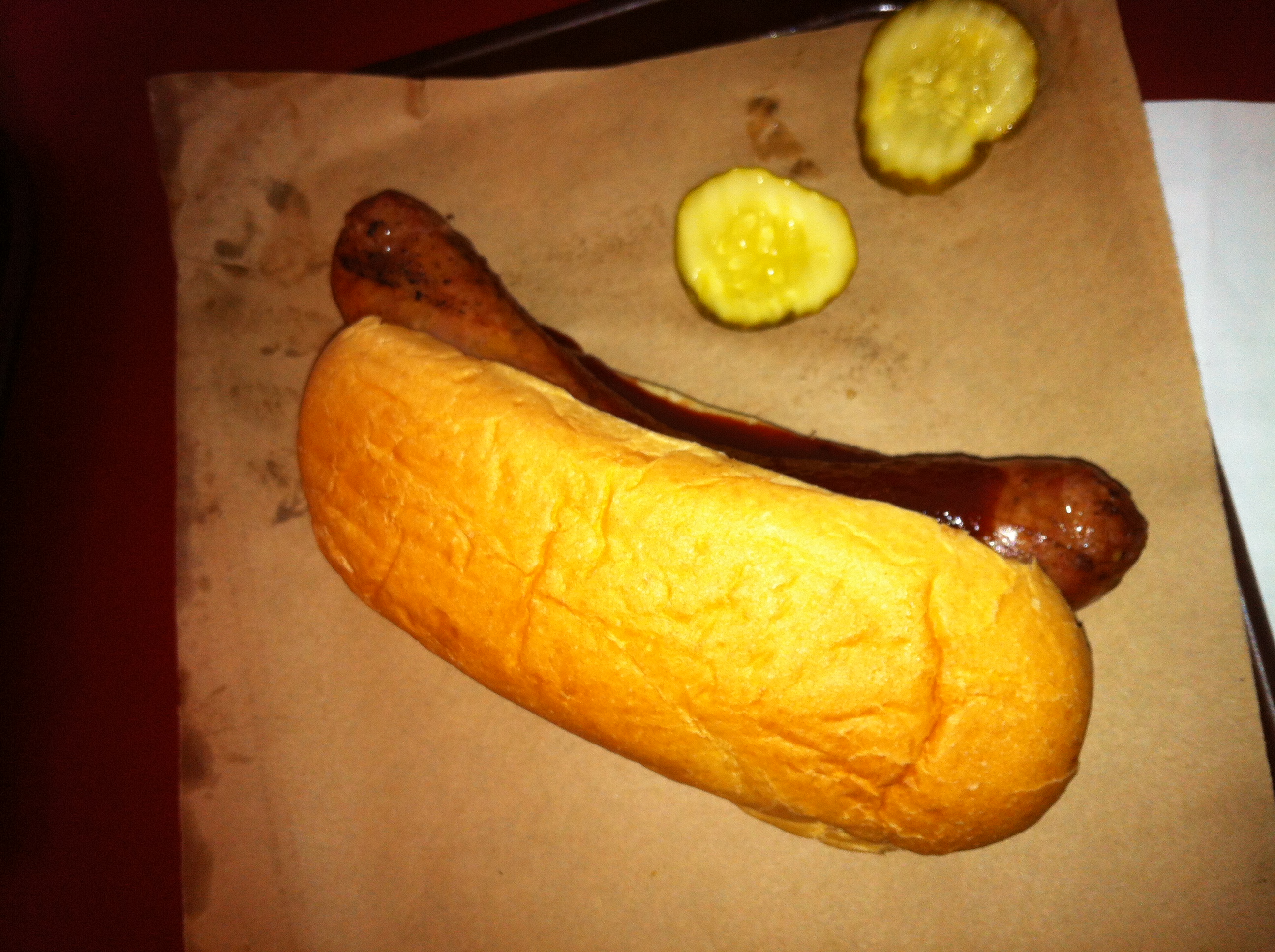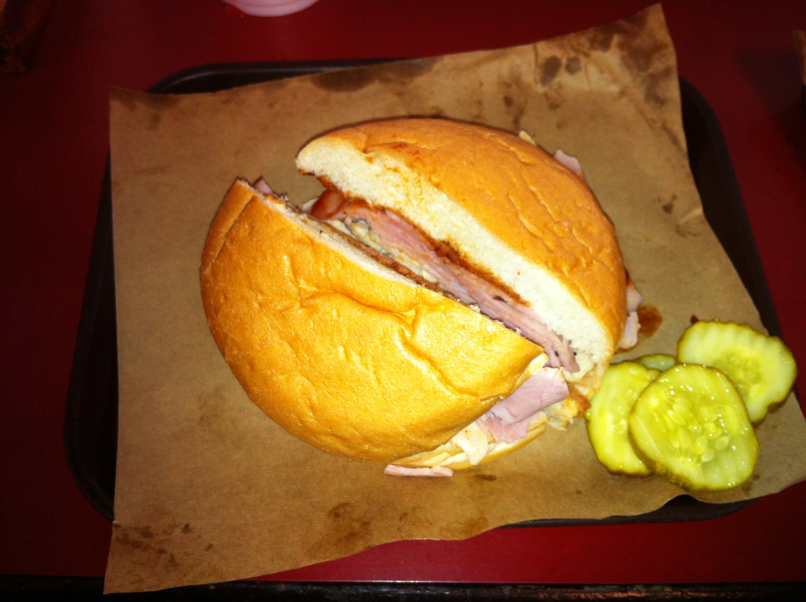The brisket was good, but thin. The slices weren’t quite as thick as the slices you get at Smitty’s, with the extra smoky marbles of fat hanging off the meat.